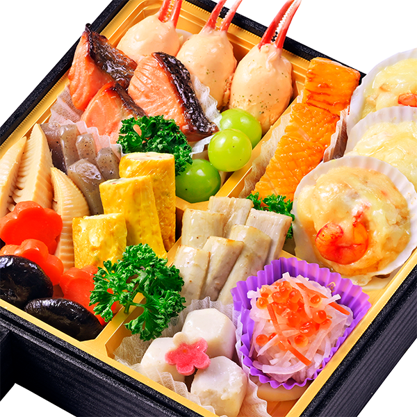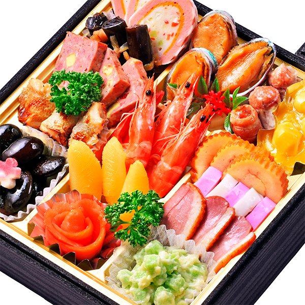 ●祝い海老の含め煮 ●あわびの福良煮 ●祝い数の子 ●サーモンローズ ●サーモンとすりみのテリーヌ ●にしんの昆布巻き ●北海道ミートローフ ●小鯛の味噌巻き ●紫花豆の芝煮 ●梅麩 ●ベーコンチーズドッック ●栗きんとん ●伊達巻 ●紅白祝い蒲鉾 ●合鴨のスモーク ●わさび風味のダイヤサラダ
