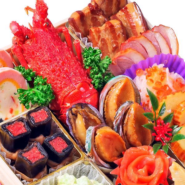 ●祝いロブスター ●あわびの福良煮 ●サーモンローズ ●豚の角煮 ●合鴨スモーク ●紅白なますいくら添え ●伊達巻 ●サーモンとすりみのテリーヌ ●紅鮭の昆布巻き ●わさび風味のダイヤサラダ