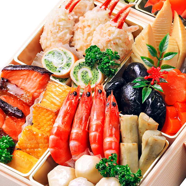●銀鮭の西京焼 ●カニ爪の華包み ●ほうれんそうのなごみ巻 ●いかの黄金焼き ●祝い海老の含め煮 ●たたき牛蒡 ●六角芋の含め煮 ●穂先筍の煮物 ●椎茸の含め煮 ●ねじり蒟蒻の煮物 ●花人参の煮物